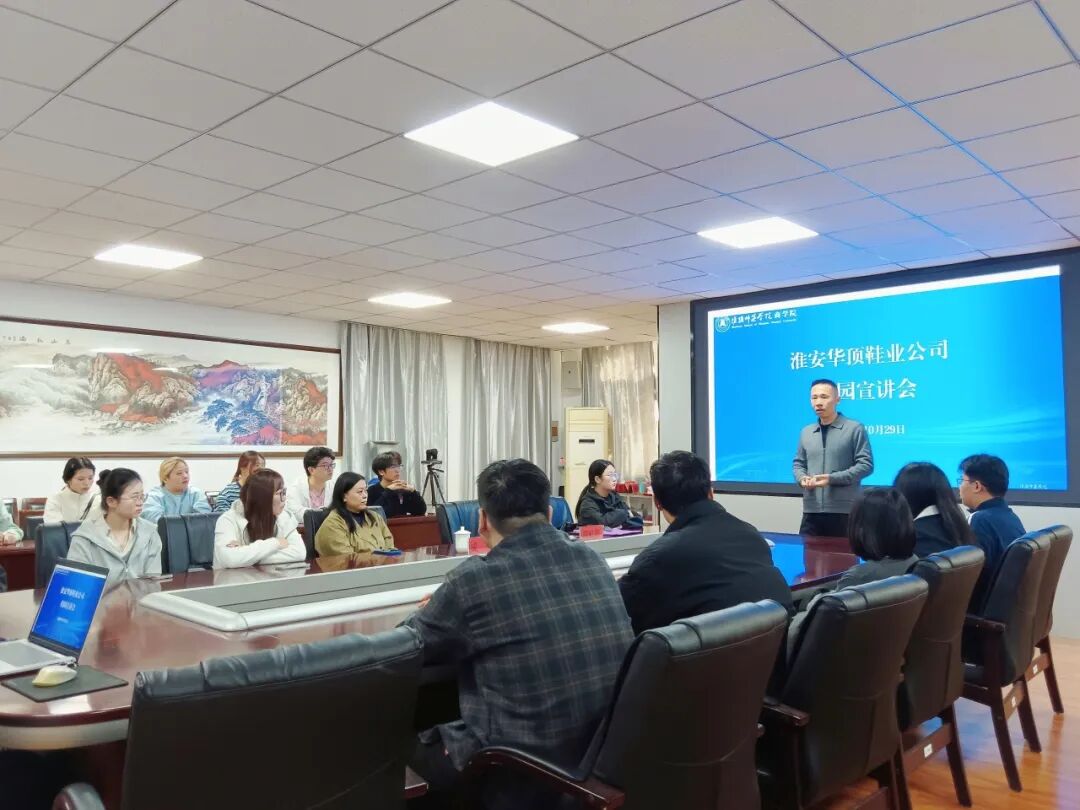 为搭建校企沟通桥梁,帮助商院学子提升匹配岗位能力,10月29日,淮安华顶鞋业公司校园宣讲会在商学院301会议室顺利开展。
