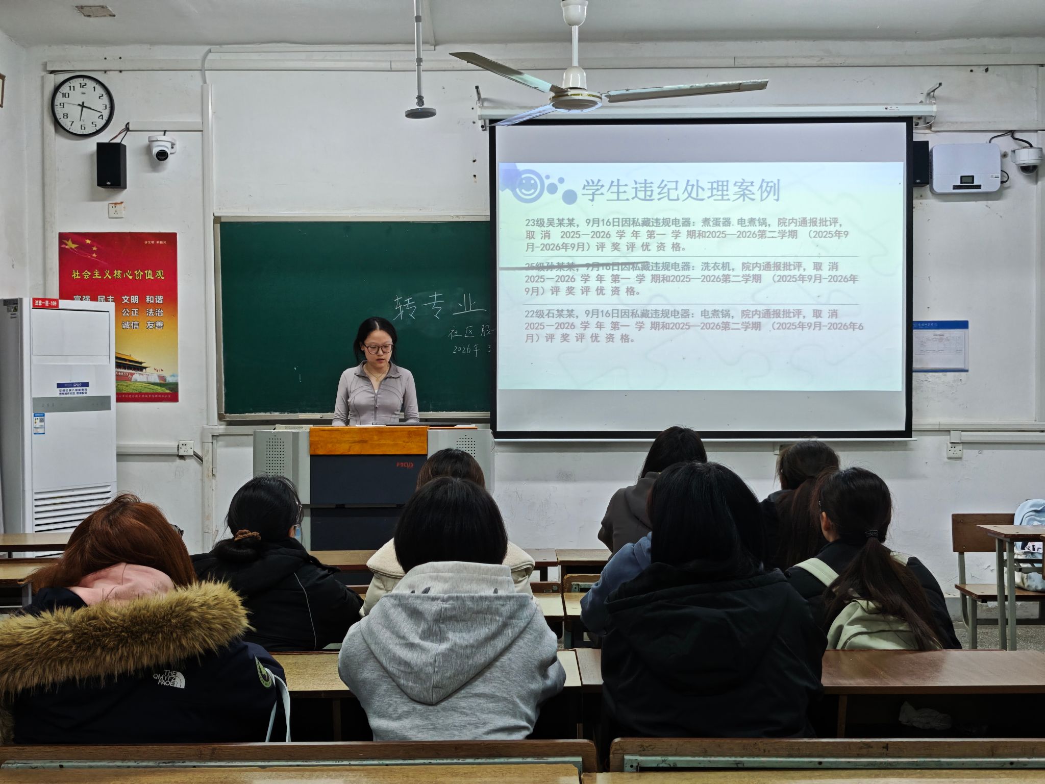 会议上,韩星辰围绕安全、卫生、校纪校规、网络防诈四个方面开展了系统阐释。在安全领域,着重强调了宿舍用电安全、人员离开时需切断电源、违规电器管理等基础要求,细致讲解了违规用电的典型案例与安全隐患;在卫生层面,结合“一站式”社区服务建设标准,针对宿舍内务整理、门前垃圾清理等工作提出了明确规范,明确了日常卫生检查的时间节点与评分标准;在校纪校规范畴,系统介绍了商学院学生管理的各项制度规定,重点解读了课堂考勤、请假流程等核心要求;在网络防诈方面,结合学校近期发生的真实案例,向学生揭露诈骗分子常用的话术及作案手段,提醒学生提高警惕。